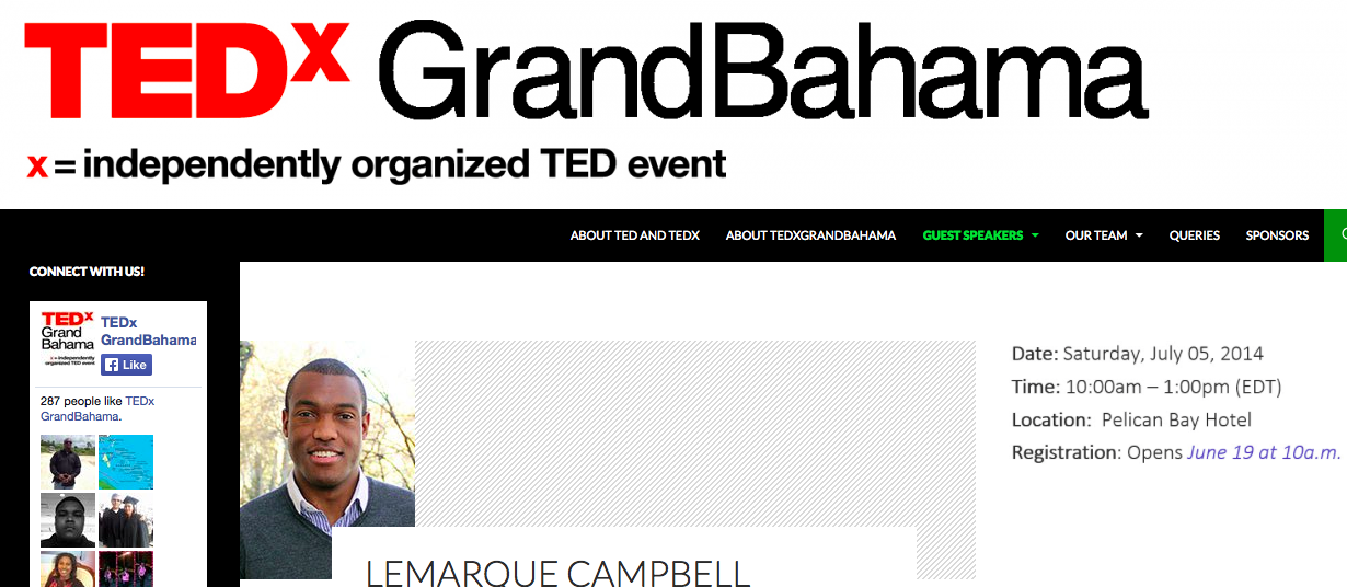 You can see his TEDx talk here and his biographical details are available here on the TEDxGrandbahama web site and are as follows: Lemarque Campbell is a Bahamian international human rights lawyer. He is currently based in the former Soviet Republic of Georgia, where he works for Transparency International (TI). Lemarque joined TI Georgia in January 2013, where he provides legal opinions on public policy issues and specializes in international and comparative law, human rights law and property rights violations. Originally from Freeport, Grand Bahama, Lemarque holds a BA in Sociology, a Postgraduate Diploma in Diplomacy, as well as an MA in Law. Lemarque was admitted to the Bar of England and Wales, Lincoln’s Inn. Additionally, he has lived, studied and worked in the US, Canada, Saint Lucia, Thailand, Malta, and England.